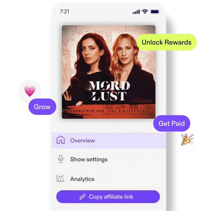 Verwandle deine Hörer*innen in Belohnungen! Mit deinem persönlichen Partner*innenlink kannst du Geld verdienen, kreative Tools freischalten und engere Beziehungen zu deinen Fans aufbauen. Jede*r neue Hörer*in, den/die du zu Podimo bringst, bringt dich der nächsten Belohnung näher.
