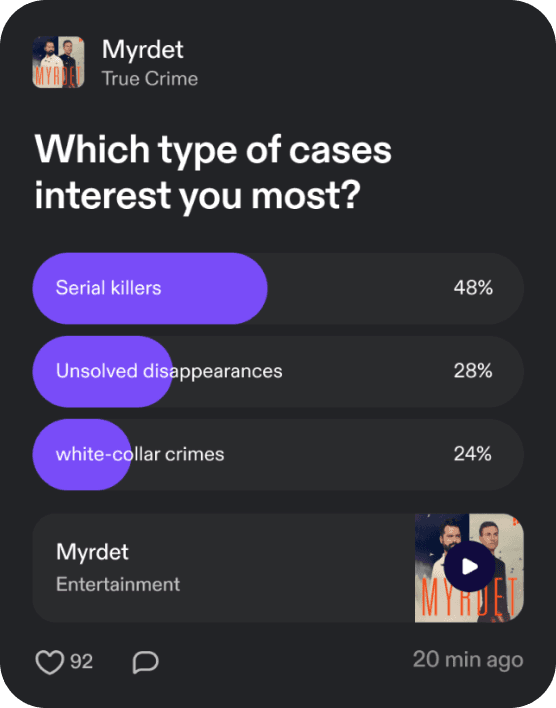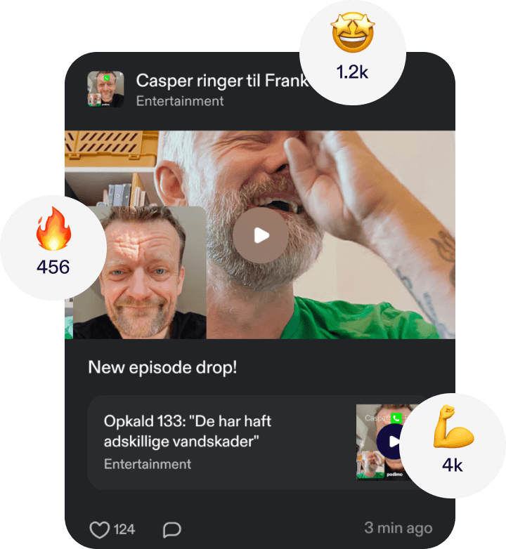 Podkaster har alltid vært en en-til-mange-opplevelse – men nå kan du gjøre det om til en samtale med fansen din. Med avstemninger, kommentarer og emojier gjør Podimo det enklere enn noensinne for skapere å kommunisere direkte med lytterne sine og invitere dem til å delta i programmet. Det handler ikke bare om å få tilbakemeldinger eller ideer – det handler om å bygge et fellesskap. Når lytterne reagerer, stemmer eller kommenterer, danner de en vane med å dukke opp – ikke bare for å lytte, men for å være en del av noe.